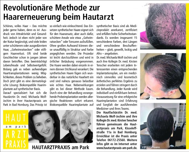 Haarimplantation in Bad Homburg Die Haarimplantation erhalten Sie in Bad Homburg exklusiv in der Hautarztpraxis am Park. Vereinbaren Sie Ihren unverbindlichen Beratungstermin.